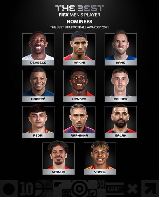 نامزدهای بهترین بازیکن سال ۲۰۲۵ فیفا عبارتند از : لامین یامال، هری کین، عثمان دمبله، ام باپه، اشرف حکیمی، کول پالمر، مندز ، پدری، محمد صلاح، رافینیا و ویتینیا.