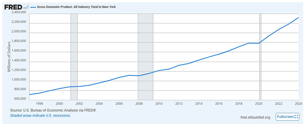 بر اساس نمودار زیر، میزان تولید ناخالص(GDP) نیویورک در سال 2024، حدود 2.3 تریلیون دلار بوده و این نمودار از دهه 90 میلادی تاکنون، روندی کاملا صعودی داشته است. اگر نیویورک یک کشور مستقل بود، با این حجم از GDP، رتبه هشتم اقتصاد جهان را به خود اختصاص میداد.