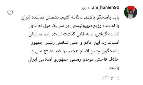 «انگار نه انگار چند ماه پیش(اسرائیلیها) اینهمه هموطنمون رو کشتن» این هم واکنش یکی دیگر از کاربران به این دیدار حاشیهساز است.