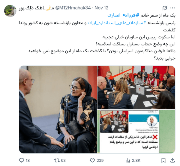 «ماهک ملکپور» هم نوشته: «یک ماه از سفر خانم فرزانه انصاری رئیس بازنشسته سازمان ملی استاندارد ایران و معاون بازنشستهشون به کشور رواندا گذشت، اما سکوت رئیس این سازمان خیلی عجیبه، این چه وضع حجاب مسئول مملکت اسلامیه؟ واقعا طرفین مذاکرهتون اسراییلی بودن؟ نمیخواید جوابی بدید؟»