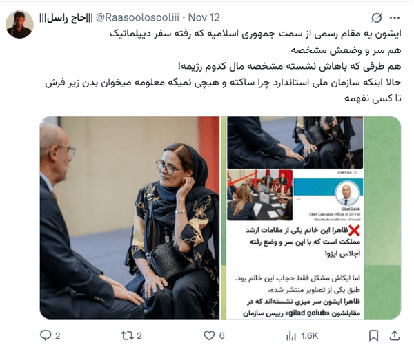 «حاج راسل» یکی از کاربران شبکه ایکس با انتشار تصویر این دیدار نوشته: «ایشون یه مقام رسمی از سمت جمهوری اسلامی رفته سفر دیپلماتیک، هم سر و وضعش مشخصه، هم طرفی که باهاش نشسته مشخصه مال کدوم رژیمه! حالا اینکه سازمان ملی استاندارد چرا ساکته و هیچی نمیگه میخوان بدن زیر فرش تا کسی نفهمه».