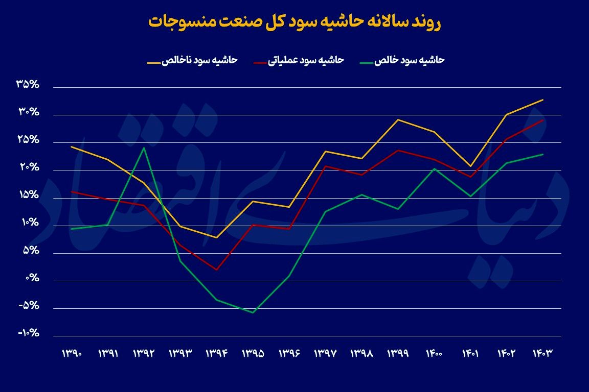 ارزیابی درآمدی شرکتهای تولیدکننده محصولات نساجی نشان میدهد که در سالهای اخیر متوسط در هر سال 42درصد به مجموع درآمد این صنعت افزوده شده است. با این حال شتاب رشد درآمد در دو سال اخیر همگام با تولیدات نزول یافته است. در سالهای 1402 و 1403 بهترتیب 25 و 4درصد به درآمد شرکتهای منسوجات بورسی افزوده شده است.