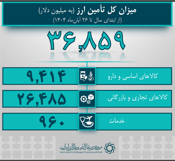 بانک مرکزی از ابتدای سال ۱۴۰۴ تا ۲۶ آبان ماه، به میزان ۳۶ میلیارد و ۸۵۹ میلیون دلار برای واردات کالای اساسی و دارو، صنایع و نیازهای خدماتی و گروه تجاری و بازرگانی تامین ارز انجام داده است.