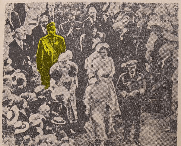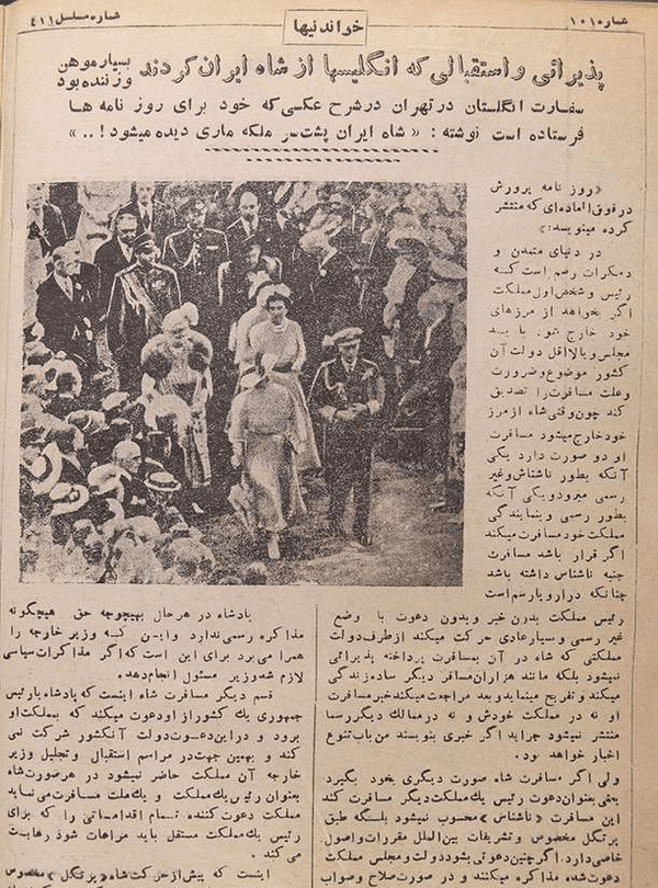 در این عکس هنگامی که پادشاه ایران یعنی مهمان پادشاه انگلستان به اتفاق خانواده سلطنتی به یک گاردنپارتی میروند، پادشاه ایران را در صف سوم حرکتکنندگان قرار دادهاند. یعنی پیشاپیش پادشاه و ملکه انگلستان، و پس از آن ولیعهد انگلستان و مادر پادشاه انگلستان و در صف سوم پادشاه ایران و دختر دوم پادشاه انگلستان حرکت میکنند.اگر بگویند که علت عقب ماندن شاه ایران احترامی است که طبعاً باید به خانمها گذاشت و چون ملکه هر مملکت دارای احترامات متشابه پادشاه است، پس چرا پادشاه انگلستان، خود در کنار ملکه و پیشاپیش شاه ایران حرکت میکند؟!این عکس که به وسیله انگلیسها برداشته شده و از سفارت انگلستان در تهران با شرح لازم آن فرستاده شده و مخصوصاً در پشت عکس قید کردهاند «شاه ایران پشت سر ملکه ماری دیده میشود!...»، پرده از روی سوءرفتار انگلستان بر میدارد و نشان میدهد پذیرایی لندن شایسته پادشاه یک مملکت مستقل نبوده است و این اهانت برای ملت ایران غیرقابل تحمل است.این عکس به هرگونه انتشارات بیپایه دولت خاتمه میدهد و نشان میدهد که «پذیرایی لندن» از چه قرار بوده است. از همه اهانتآورتر هنگام حرکت شاه از لندن، «ژنرال لویی مونت باتن» از طرف شاه انگلیس از پادشاه ایران بدرقه کرده است.»