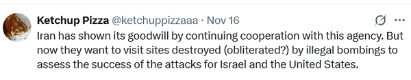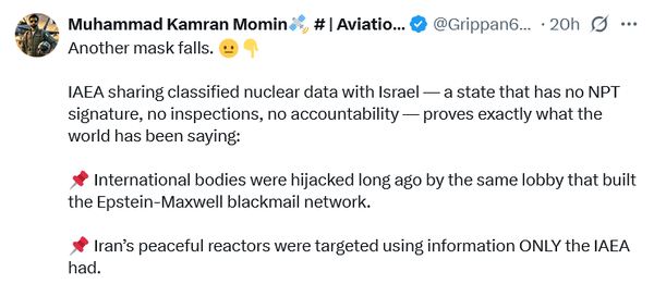 یک نقاب دیگر فرو افتاد. 😐👇به اشتراک گذاشتن دادههای هستهای طبقهبندی شده توسط آژانس بینالمللی انرژی اتمی با اسرائیل - کشوری که هیچ امضای NPT، هیچ بازرسی و هیچ پاسخگویی ندارد - دقیقاً همان چیزی را ثابت میکند که جهان میگفته است:......... راکتورهای صلحآمیز ایران با استفاده از اطلاعاتی که فقط آژانس بینالمللی انرژی اتمی در اختیار داشت، هدف قرار گرفتند.