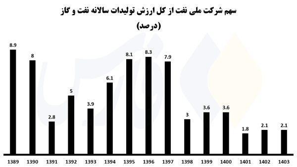 اما آمار رسمی شرکت ملی نفت تصویر متفاوتی ارائه میدهد: سهم واقعی این شرکت از ارزش تولیدات نفت و گاز طی ۱۵ سال گذشته در بهترین حالت تنها حدود ۹ درصد بوده است. این سهم در سه سال گذشته حتی کاهش بیشتری داشته و به کمتر از ۲ درصد رسیده است؛ موضوعی که به گفته برخی کارشناسان، ظرفیت سرمایهگذاری و توسعه در صنعت نفت را به شدت محدود کرده است.