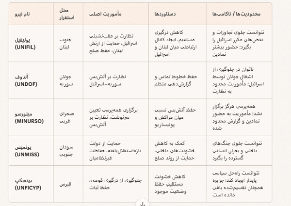 ارزیابی کارایی نیروهای حافظ صلحبه اذعان ناظران سیاسی و نظامی، نیروهای حافظ صلح سازمان ملل مانند یونیفل در لبنان و آندوف در جولان اشغالی توانستهاند تا حدودی مانع از گسترش درگیری شوند، اما در عمل نتوانستهاند جلوی جنگها، اشغالگری یا نقضهای مکرر آتشبس به ویژه توسط اسرائیل را بگیرند.لذا میتوان گفت که همواره به دلیل فشار قدرتهای بزرگ، مأموریتهای این نیروها، بیشتر جنبه نمادین دارد.مأموریت اصلی یونیفل، نظارت بر عقبنشینی اسرائیل و کمک به دولت لبنان برای اعمال حاکمیت در جنوب کشور بود. پس از جنگ ۲۰۰۶ وظایفش گسترش یافت، از جمله حمایت از آوارگان و همکاری با ارتش لبنان.با وجود حضور بیش از ۱۰ هزار نیروی چندملیتی، یونیفل نتوانست جلوی تجاوزات اسرائیل یا نقض مکرر حریم هوایی و زمینی لبنان را بگیرد. همین ناکامی باعث شد بارها مناقشاتی درباره پایان مأموریت یا کاهش نقش آن در شورای امنیت مطرح شود.آندوف در جولان اشغالی نیز در سال ۱۹۷۴ برای نظارت بر آتشبس میان سوریه و اسرائیل تشکیل شد. مأموریت آن محدود به «نظارت» است و اختیار مداخله نظامی ندارد؛ بنابراین نتوانست مانع از اشغال بلندمدت جولان توسط اسرائیل شود.در سالهای اخیر، با تغییرات سیاسی در سوریه و حضور نیروهای مختلف، کارایی آندوف بیشتر به گزارشدهی و حضور نمادین تقلیل یافته است.