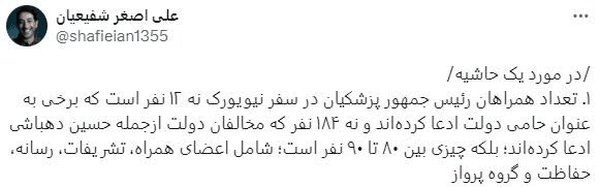این توئیت هیاهوی بیشتری پیرامون سفر مذکور ایجاد کرد تا اینکه «علی اصغر شفیعیان» چهره رسانهای نزدیک به دولت مطرح کرد که نه 12 نفر و نه 186 نفر بلکه چیزی ما بین 80 الی 90 نفر رییسجمهور را در سفر به سازمان ملل همراهی میکنند.
