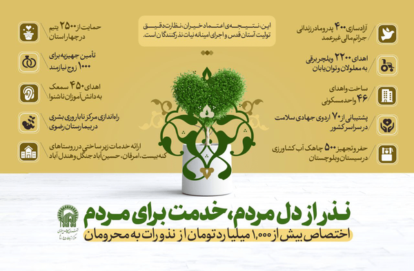 خادمان امام رضا(ع) هزار میلیارد تومان از نذورات مردمی را در موضوعاتی چون رسیدگی به ایتام، آزادی زندانیان، جهیزیه نوعروسان، حمایت از معلولان، ساخت مسکن برای محرومان و... هزینه کردند.