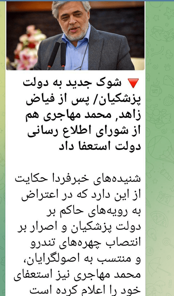 برخی کانال ها نوشته اند که پس از فیاض زاهد، محمد مهاجری هم از شورای اطلاع رسانی دولت استعفا داد.