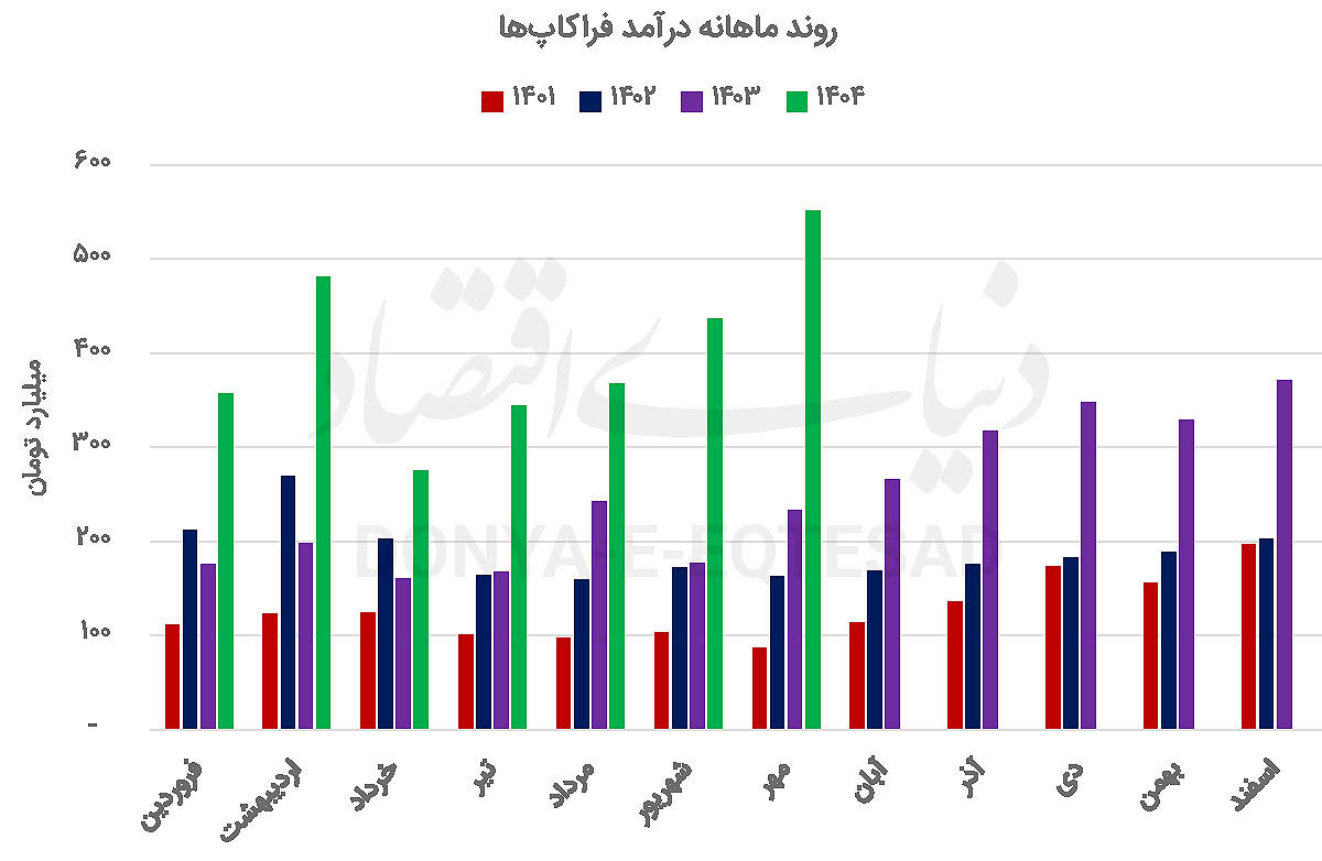 ارزیابی درآمد ارائه خدمات شرکتهای فراکاپ بورسی نشان میدهد که در ۱۳سال اخیر متوسط در هر سال ۵۵درصد به درآمد این گروه افزوده شده است. در سال ۱۴۰۳، بر اثر رکود معاملاتی و کاهش چشمگیر تعداد سهامداران فعال بازار سرمایه، درآمد این گروه با کاهش ۶۶درصد به ۷۷۵میلیارد تومان نزول یافت. بالاترین میزان جهش درآمدی این صنعت مربوط به سال ۹۹ بوده است. در این سال درآمد کارمزد خدماتی فراکاپیها با افزایش ۲۲۱درصد مواجه شد که عامل اصلی این رونق بیسابقه درآمدی ورود سهامداران حقیقی بالایی بود که به بازار سهام هجوم آوردند و حجم معاملات بطرز شگفتانگیزی افزایش یافت. برخلاف سال گذشته، طی هفت ماه نخست امسال وضعیت درآمدی صنعت فراکاپ به دلیل رونق معاملات بازار سهام مثبت بوده است.