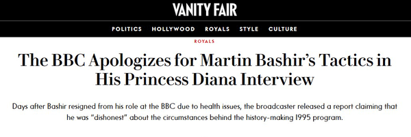 در سال 1995 بیبیسی مصاحبهای با دایانا داشت. اما 25 سال بعد، یعنی در سال 2021، گزارشی منتشر شد که ثابت میکرد بیبیسی در این مصاحبه از ترفندهای «فریب و دروغگویی» مقابل دایانا استفاده کرده بود. انتشار این گزارش باعث شد که بیبیسی بعد از گذشت دو دهه، مجبور به عذرخواهی شود.