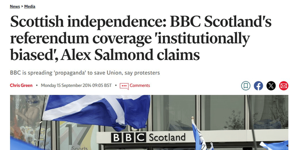 ماجرا به انتخابات استقلال اسکاتلند از پادشاهی انگلستان در سال 2014 باز میگردد. رفراندوم استقلال اسکاتلند در 18 سپتامبر برگزار و نتیجه آن به سود کمپین «نه» اعلام شد. با این حال، بسیاری معتقدند که رأی نه به استقلال، رأی واقعی مردم نبود؛ بلکه دولت انگلیس با استفاده از عوامل مختلف، رأی بسیاری از مردم را عوض کرد. طرفداران استقلال اسکاتلند معتقد بودند که بیبیسی نیز در این فرآیند دست داشت. آنها مقابل دفتر مرکزی بیبیسی در اسکاتلند تجمع کردند و این رسانه را «دروغگو و دارای سوگیری» خطاب قرار دادند.