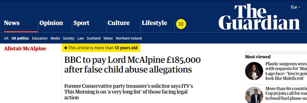 در سال ۲۰۱۲، بیبیسی در یکی از برنامههای خود با نام «نیوز نایت» که به دنبال بررسی مسائل مربوط به سوءاستفادههای تاریخی بود، بهاشتباه شخصی به نام «لرد مکآلپین» را درگیر ماجرا کرد و او را به سو استفاده جنسی از کودکان متهم نمود.