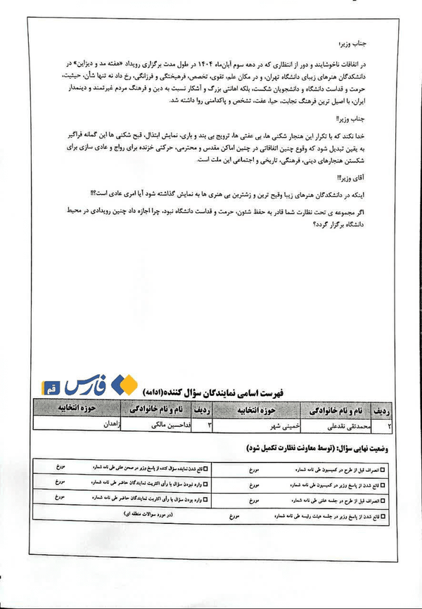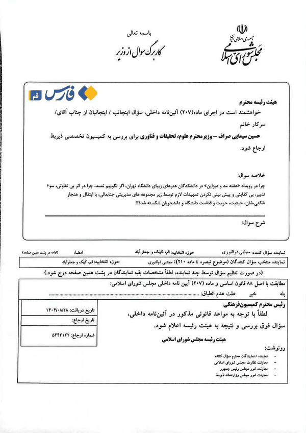 درپی هنجارشکنیهای رویداد «هفته مد و دیزاین» در دانشکدگان هنرهای زیبای دانشگاه تهران، نماینده مردم قم و عضو کمیسیون قضایی و حقوقی مجلس شورای اسلامی، وزیر علوم را برای پاسخگویی به مجلس فراخواند.