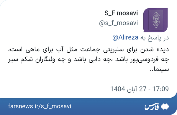 موسوی نیز نوشت: «دیدهشدن برای سلبریتیها مثل آب برای ماهی است؛ چه فردوسیپور باشد، چه دایی، چه ولنگارهای سینما.»