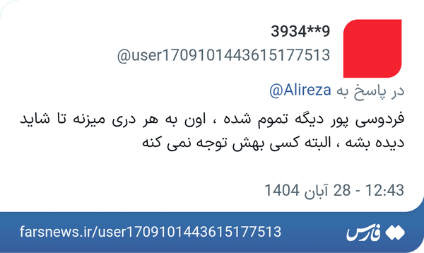 کاربر دیگری بیان کرد: «فردوسیپور تمام شده؛ به هر دری میزند دیده شود.»
