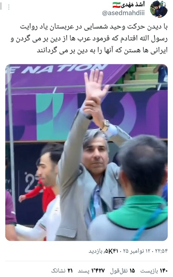 یکی از کاربران به نام اسد مهدی گفت: «با دیدن حرکت شمسایی در عربستان یاد روایت رسولالله افتادم که فرمود عربها از دین برمیگردند و ایرانیها آنها را به دین برمیگردانند.»
