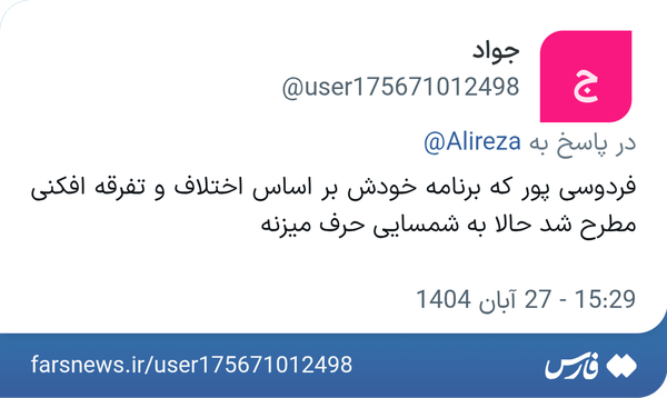کاربر دیگری نوشت: «فردوسیپور که خودش خدای جنجال است، میآید از وحدتشکنی شمسایی حرف میزند. حد و اندازه خودت را حفظ کن؛ همین حرفی که زدی خودش بذر تفرقه است.»