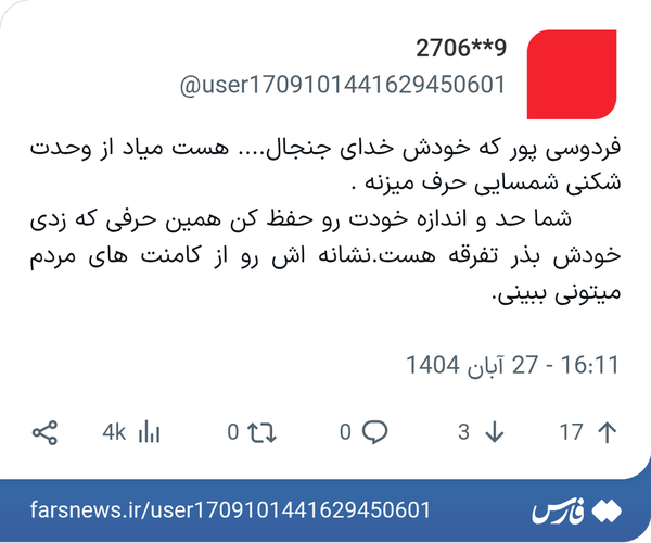همچنین محمد گودرزی زاده یکی از کاربران فارس تعاملی نیز در واکنش به این موضوع متنی را با عنوان «چی شده یهو فردوسی پور نگران وحدت شده؟» را نوشته است که میتوانید اینجا بخوانید.