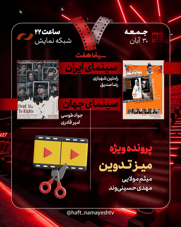 جواد طوسی و امیر قادری نیز در میز سینمای جهان به نقد و بررسی «حکم مرگ» (Dead to Right) میپردازند.برنامه سینمایی «هفت» به تهیهکنندگی محمدحسین تنکابنی و اجرای محمدرضا مقدسیان جمعهشبها ساعت ۲۲ روی آنتن شبکه نمایش میرود.انعکاس اخبار را اینجا بخوانید.#هفت #نقد #سینما_شهر_قصه #حکم_مرگ #میز_تدوین #نمایش