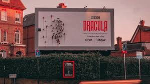 بیلبورد تبلیغاتی فیلم دراکولا با استفاده از فناوری نور و سایه تنها موقع شب و تاریکی نمایش داده میشود. این نوع تبلیغات با تکنیکهای نوری یا سایه طراحی شده تا در شب جلوهای ترسناک و تعاملی ایجاد کند.