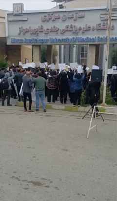گروهی از کارکنان دانشگاه علوم پزشکی جندیشاپور روز دوشنبه ۲۴ آذر ۱۴۰۴ در اعتراض به وضعیت کاری و معیشتی خود، مقابل ورودی ساختمان در اهواز تجمع کردند.