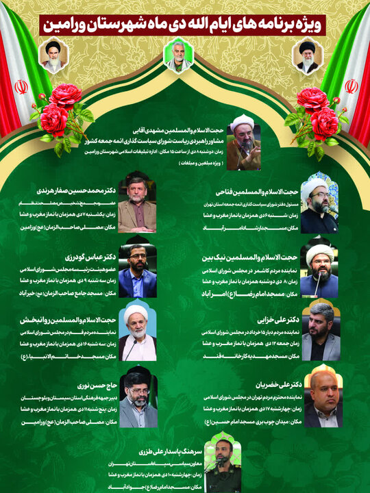 عبدالرحیمی با اشاره به دیگر مناسبتهای مهم دیماه گفت: سالگرد شهادت سردار سپهبد حاج قاسم سلیمانی، سالگرد ارتحال علامه مصباح یزدی و همچنین سالگرد شهدای دهم دیماه ورامین از دیگر محورهای برنامهریزیشده در این ایام است که برنامههای ویژهای برای آنها در نظر گرفته شده است.
