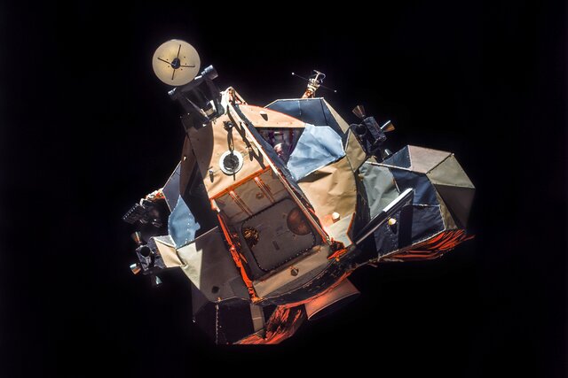 به نقل از ناسا، این عکس که به صورت دیجیتالی اصلاح و پردازش مجدد شده است، مرحله صعود چلنجر را در مدار ماه نشان میدهد. پیشرانههای کوچک کنترل واکنش در دو طرف فضاپیما قرار دارند و زنگ موتور موشک صعود زیر آن قرار گرفته است.