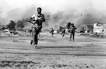 منزلش آب داشت. محمود و مهدی پیاده شدند برای برداشتن آب و خودم به اتفاق رسول رفتیم به خیابانهای آبادان و احمدآباد سر بزنیم. خیابان امام خمینی و امیری و طالقانی آبادان را گشتیم. دکانها همه بستهاند فقط تک توکی باز بودند که آنها را تشویق کرده و به وسیلهی آنها سفارش دادیم به دیگران که بیایند و دکانهای خود را باز کنند. حین مراجعت از آبادان، در مسجد بهبهانیها آقای دهدشتی را ملاقات کردم. ایشان با تمام خانواده در یک مغازهی لوازم یدکی پیکان روبهروی مسجد بهبهانیها جای گرفتهاند، زیرا منزل مسکونیش در اثر اصابت خمپاره قابل سکونت نیست. از ایشان خواهش کردم یک صبانه یا کوزهی آب خوری برایمان پیدا کند که قدری آب را خنک نگه دارد. از آنجا به خیابان یک احمدآباد آمدم. چند تا دکان باز بود. به بعضی از آنها سری زده و آنان را تشویق و وادار کردم به دیگران سفارش کنند که دکانها را باز کنند. از آنجا هم به ادارهی رادیو رفتم. حالا ساعت در حدود ۱۰ صبح است. در ادارهی رادیو دیدم آقای دکتر صادقی با چند نفر در لباس فرم نظامی و عمامه بر سر نشستهاند. آقای دکتر صادقی برای یک سخنرانی به زبان عربی به رادیو آمده بود.